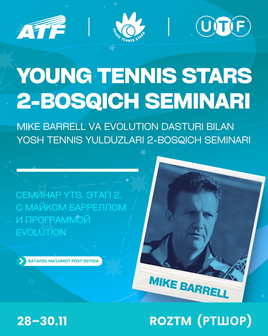 O‘zbekiston Tennis Federatsiyasi Asian Tennis Federation (ATF) va Respublika Olimpiya Zaxiralari Tennis Maktabi bilan hamkorlikda 2025-yil 28–30-noyabr kunlari Toshkent shahrida yosh tennischilarni rivojlantirishga qaratilgan Young Tennis Stars (YTS) dasturi doirasida ATF Performance Tennis uch kunlik seminarini o‘tkazadi.