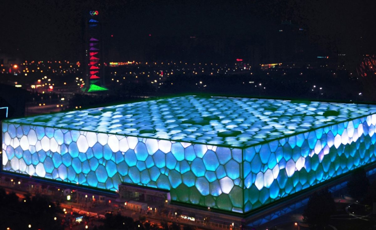 Необычное здание в Китае завораживает с первого взгляда. Построили его специально к Пекинской Олимпиаде 2008 года. Оформление комплекса напоминает скопление огромных мыльных пузырей в гигантском аквариуме. Квадратная форма сооружения была выбрана неслучайно: «воздушное» оформление комплекса вместе с угловатой формой должны были вместе отразить «инь и янь Олимпиады в Пекине».