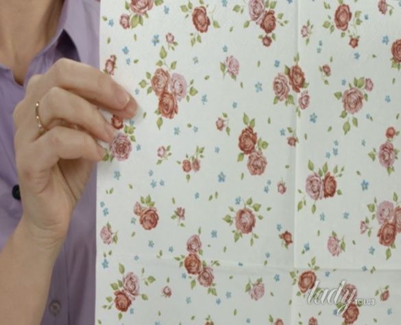 Для декупажа подойдут салфетки с цветочными мотивами. Аккуратно вырежьте цветы по контуру рисунка и разделите их на три слоя.