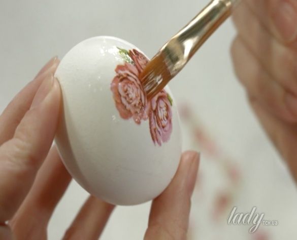 Декупаж – это наклеивание, но клей использовать на съедобных яйцах не стоит. Его заменит яичный белок.