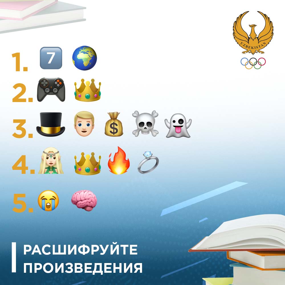 Сегодня мы снова с вами угадываем литературные произведения:) Несколько из них вы изучали в школе, а какие-то знаете по фильмам Источник: Официальный сайт Национального Олимпийского Комитета — www.olympic.uz