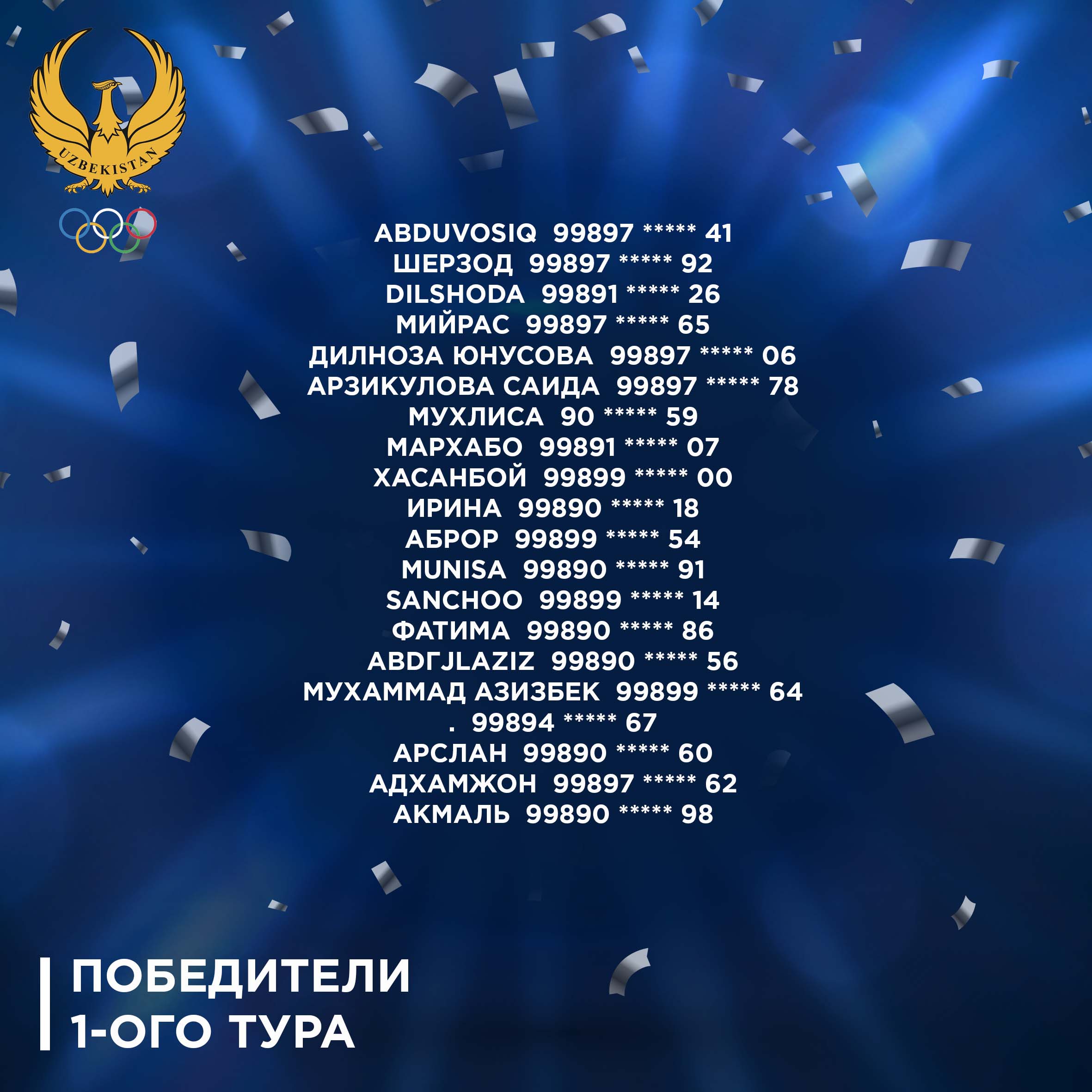Друзья, а вот и наши первые счастливчики, ставшие победителями в 1-ом туре нашей интеллектуальной викторины. Давайте поздравим их! Подписывайтесь на наш бот в Telegram: https://t.me/olympicuzbot Источник: Официальный сайт Национального Олимпийского Комитета — www.olympic.uz