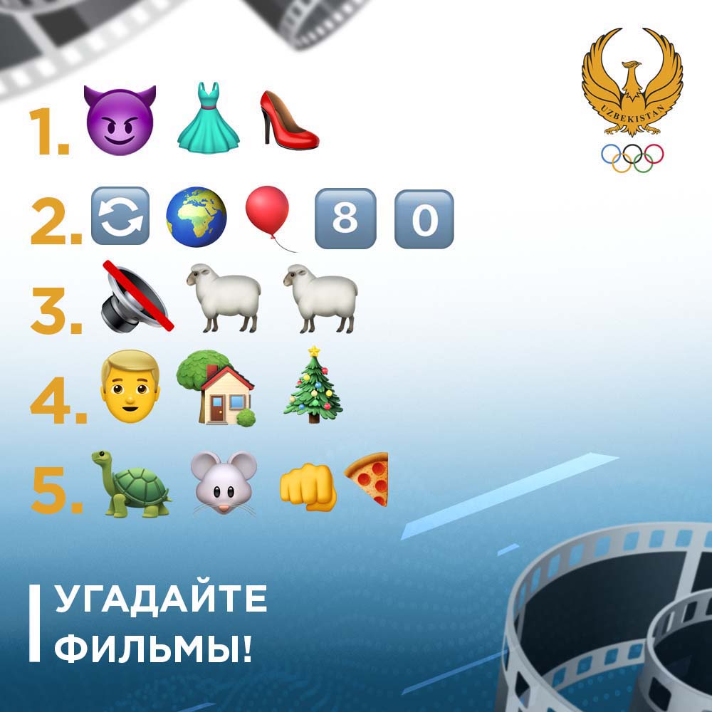 Сегодня мы усложнили задачу и загадали с помощью эмоджиков более современные фильмы. Сможете ли вы угадать, давайте посмотрим:) Наша страница Facebook: https://www.facebook.com/nocuzbekistan Наша страница Instagram: https://www.instagram.com/p/B-ra53rFtlE/ Наша страница Одноклассники.ру: https://ok.ru/group/56786844057789 Источник: Официальный сайт Национального Олимпийского Комитета — www.olympic.uz