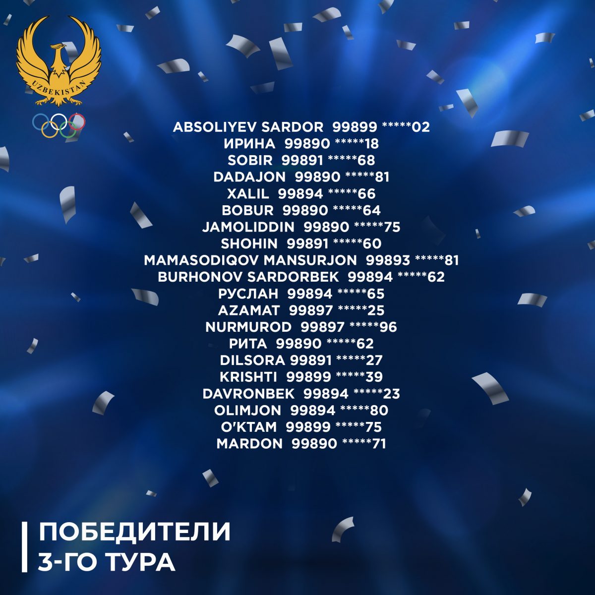 Мы готовы представить вам победителей 4-го тура нашей интеллектуальной викторины! Поздравляем! Участвуйте в нашей викторине и становитесь обладателями ценных призов! Подписывайтесь на наш бот в Telegram: https://t.me/olympicuzbot и на наш канал в YouTube: https://goo.su/0zmY Источник: Официальный сайт Национального Олимпийского Комитета — www.olympic.uz
