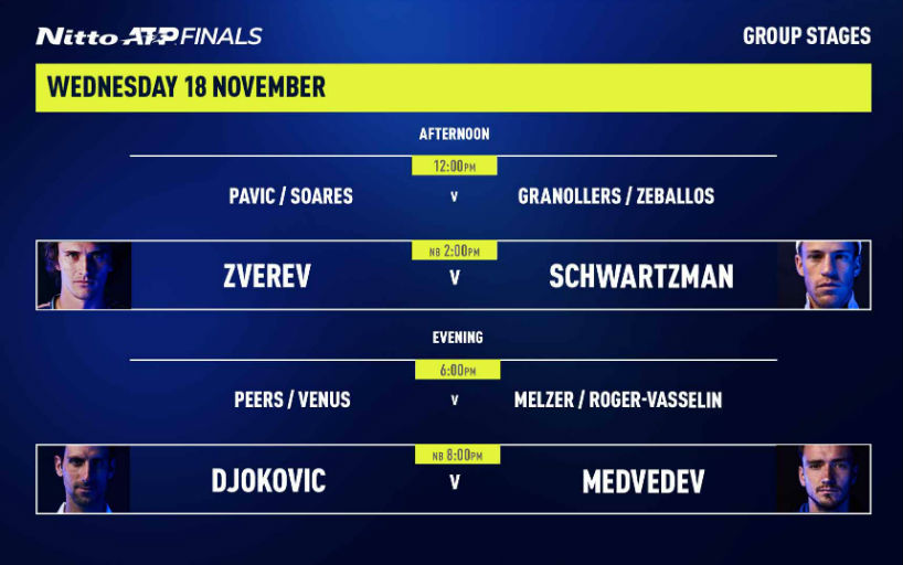 Среда, 18 ноября — четвёртый игровой день Итогового турнира ATP в Лондоне. В этот день продолжатся матчи группового этапа в одиночном и парном разряде. Завтра на лондонские корты выйдет один россиянин — Даниил Медведев. O2 Arena. Начало в 12:00 (15:00 по московскому времени) Марсель Гранольерс и Орасио Себальос (Испания/Аргентина) — Мате Павич и Бруно Соареш (Хорватия/Бразилия) […]