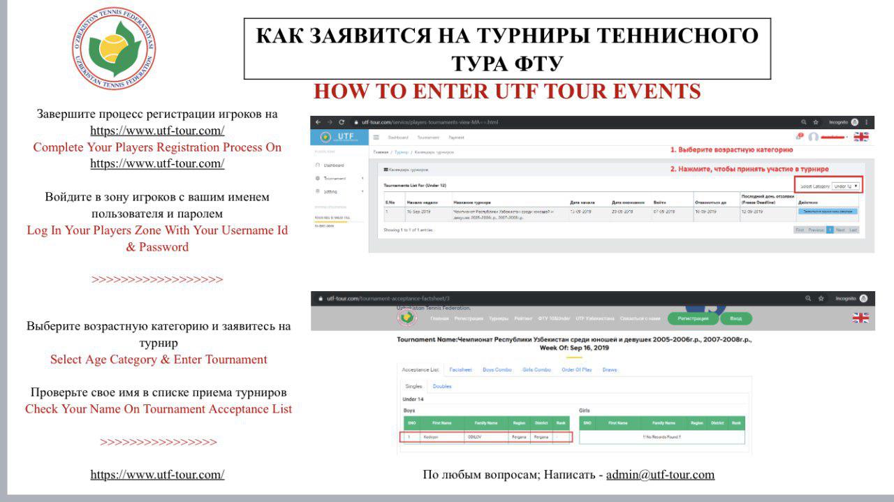 Федерация тенниса Узбекистана с 15 августа начала процесс внедрения электронной системы проведения турниров (в тестовом режиме). Запуск данной электронной системы откроет путь для регистрации всех игроков, тренеров и других заинтересованных сторон, связанных с Федерацией тенниса, что позволит ФTУ-Тур предоставлять автоматизированные услуги каждому участнику. Пройдите по ссылке: utf-tour.com и зарегистрируйтесь. Инструкция по регистрации в электронной системе […]
